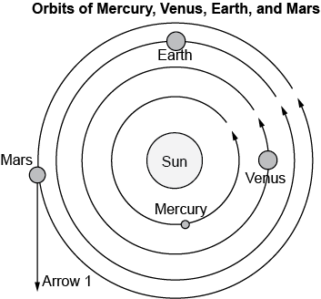 21. The diagram shows the orbits of several planets in the solar system. What would cause Mars to follow the path marked with Arrow 1 instead of following its orbit?