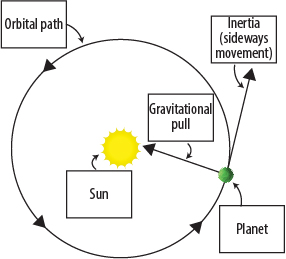 Gravitational pull is exerted by the Sun toward itself. A sideways force is exerted by the planet due to its inertia of motion. The inertia causes the planet to revolve around the Sun in a circular path. The circular path is the orbit of rotation of the planets.