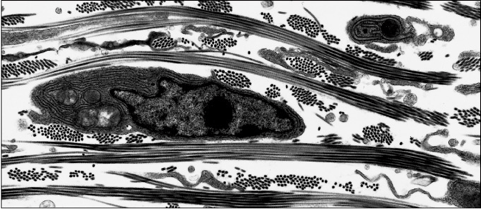 The small dots are these extracellular fibers that are perpendicular to those shown in this EM image.