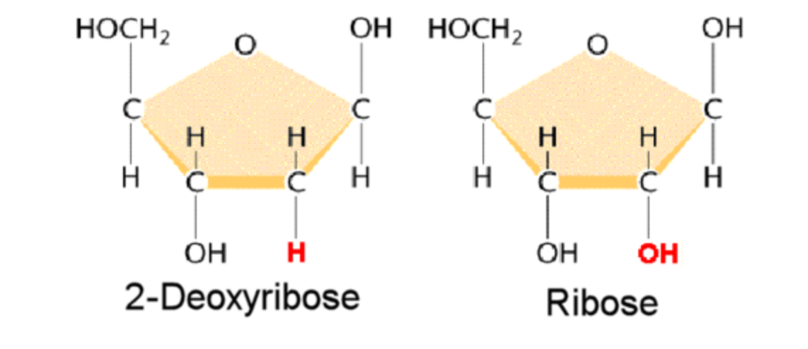 Ribose has an additional oxygen on the 2' C, while deoxyribose is missing an oxygen on the same position (so only H instead of OH)
