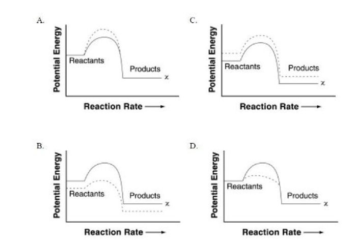 Which graph BEST shows the chemical reaction with and with an enzyme present.