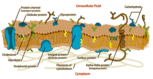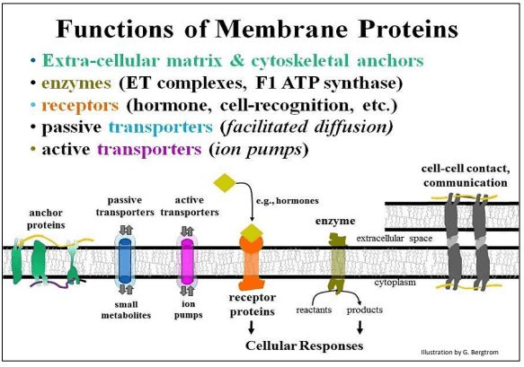 These molecules may be embedded on either the inner or outer surface of the cell membrane or extend through the membrane from the outside of the cell to the inside of the cell. (Hint: These are made of amino acids.)