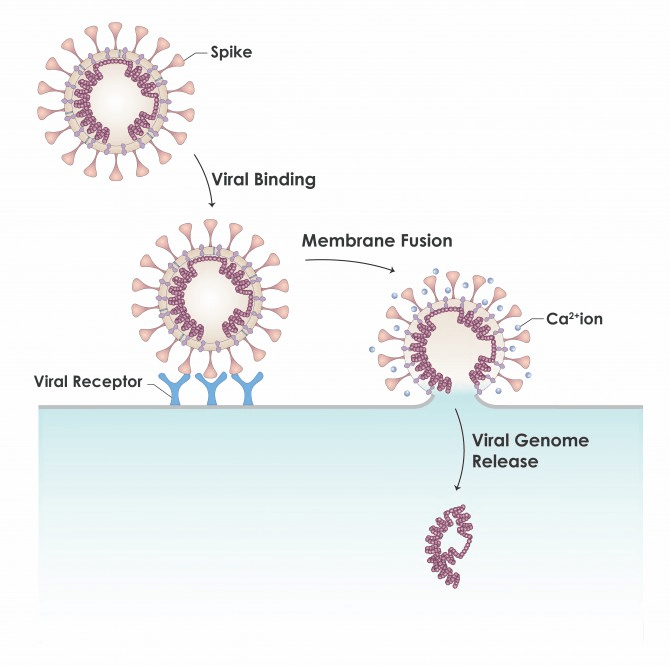 SARS-CoV-2 requires a eukaryotic host cell to reproduce. Early in the reproductive cycle the virus recognizes the host cell and does this to enter the host cell.