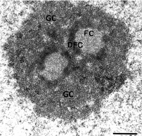 This nucleus is from a HeLa cell. It contains two smaller structures involved in the synthesis of ribosomes. These structures are called...