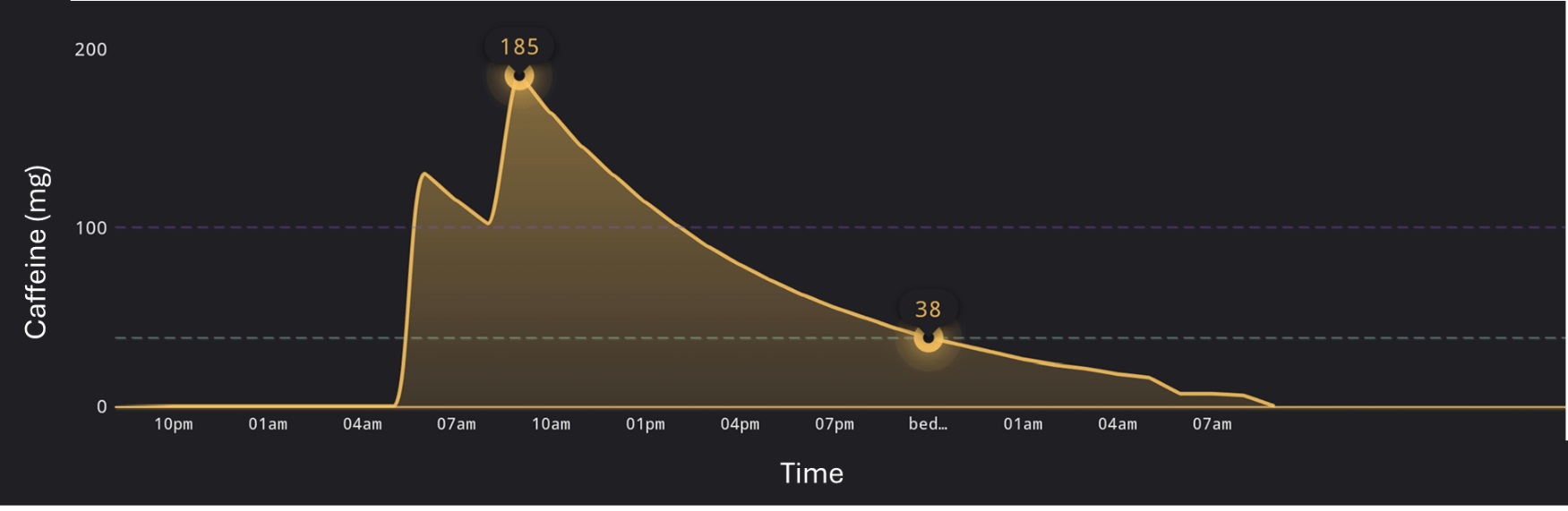 According to this graph of my caffeine intake today, roughly how much caffeine am i working with RIGHT NOW. Like, at this very moment.