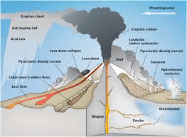 Large, steep mountain, built up by layers of ash, lava and cinders.