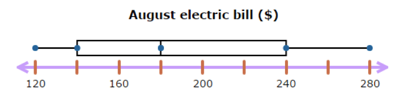 The local utility company released a report showing the August electric bills of their customers. This box-and-whisker plot shows the results.