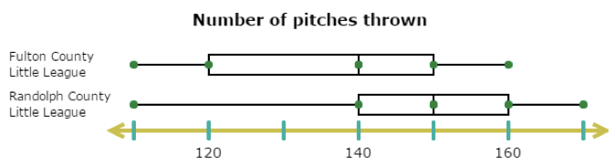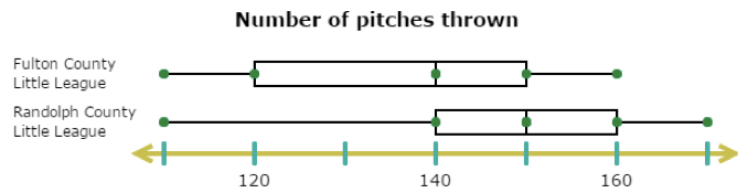 A) Randolph County has better pitchers. B) Fulton County has fewer pitchers. C) The median number of pitches thrown by Randolph pitchers is higher than that of Fulton. D) Randolph County will win more games.