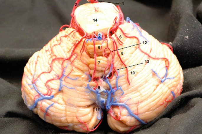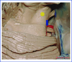 What portion of cerebellum has been removed to view the yellow dot structure?