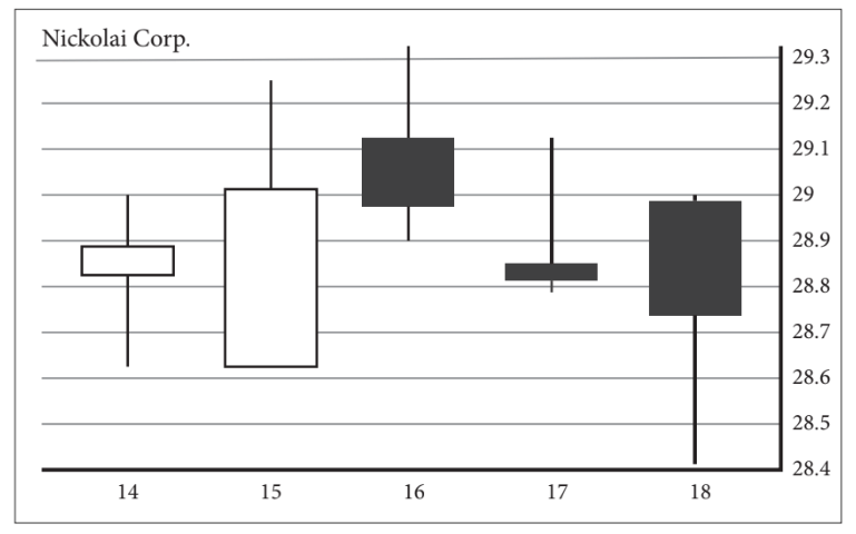 What was the low, high, open, and close for Nickolai Corp on the 15th?