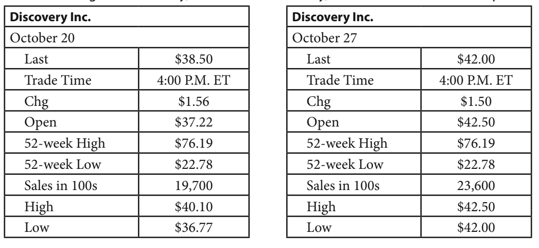 Use the October 19 closing price from above and the October 20 opening price to find the difference in prices as a percent increase. Round to the nearest hundredth percent.