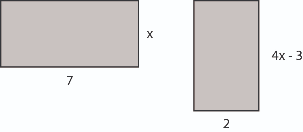 The equation for three times the difference of two times "m" and five is equal to eight times "m" to the second power increased by four.