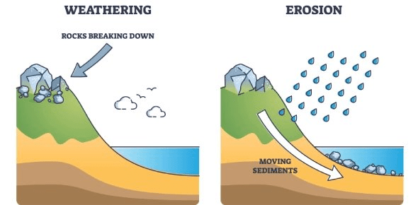 What is weathering is the process of wearing down rock, while erosion is the process of moving rock/soil?