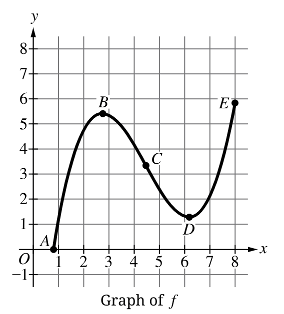 The figure shows the graph of a function f . The zero and extrema for f are labeled, and the point of inflection of the graph of f is labeled. Let A, B, C, D, and E represent the x -coordinates at those points. On which interval is f increasing and the graph of f concave down?
