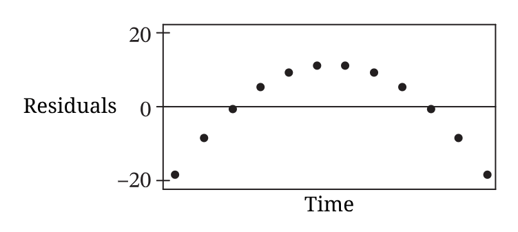 A food vendor developed a new sandwich type for sale. The vendor made estimates about the sales of the new sandwich type over time. A linear regression was used to develop a model for the sales over time. The figure shows a graph of the residuals of the linear regression. Is a linear model appropriate or not appropriate to estimate their future sales and justify your reasoning.