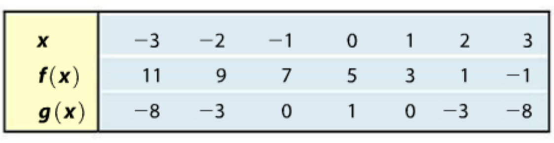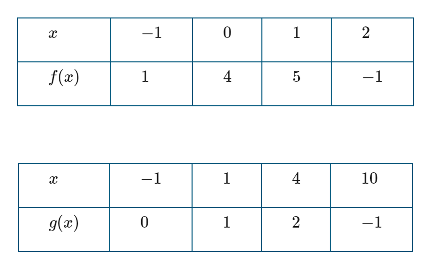 The tables give values of the functions f and g for selected values of x . What is the value of g^(-1)(f(2)) ?