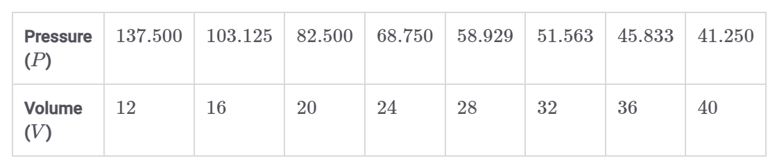 Boyle's Law states that the pressure of a gas is inversely proportional to the volume of the gas at a constant temperature. The table gives the volume V , in milliliters (mL), of a gas for selected pressures P . What model will depict the volume of the gas as a function of pressure?
