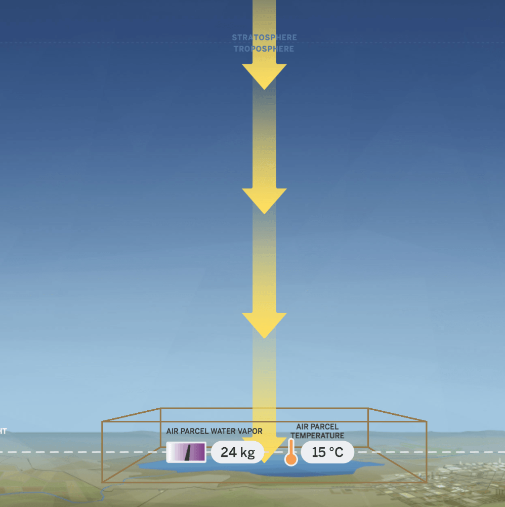 When liquid water from the lake becomes warmer, it can evaporate and become water vapor in the air. All air contains water. When water vapor in an air parcel cools, it can condense into liquid water which can form a cloud and fall as rain. Energy transfers from warm air to cold air until the temperatures become equal. The more an air parcel loses energy and cools, the more rainfall can happen.