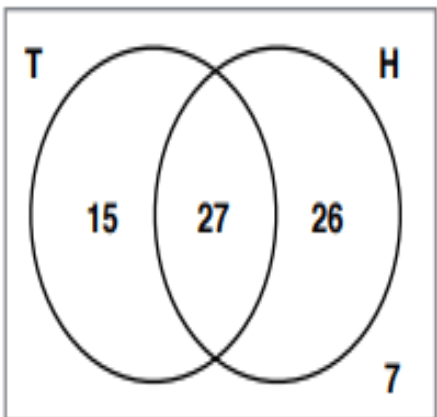 The Venn diagram alongside shows the number of people in a sporting club who play tennis (T) and hockey (H). What is the probability of a student playing hockey, given that they do not play tennis.