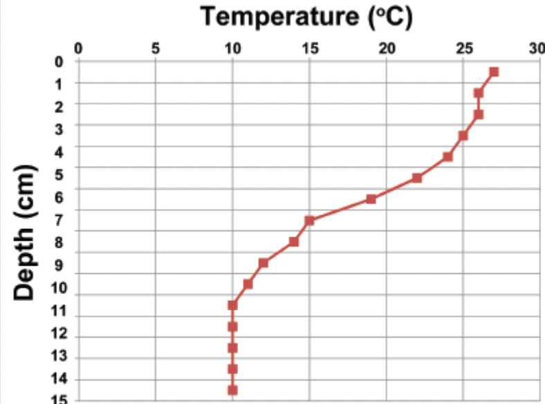 Según este gráfico, ¿a qué profundidad estaba el agua a 15 grados centígrados? (no olvides las unidades)