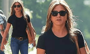 Ella o Jennifer Aniston lleva una camiseta negra y los jeans.