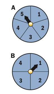 You spin spinner A two times. Find the probability that the spinner stops on 1, then 2.