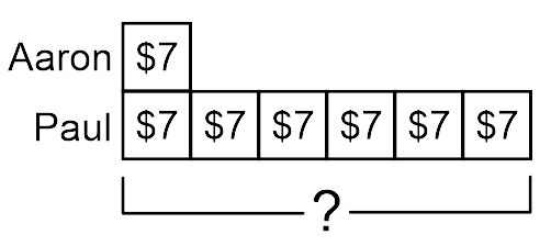 Aaron spent $7 at the store. Paul spent 6 times as much money as Aaron. How much money did Paul spend? (You must include a bar model.)