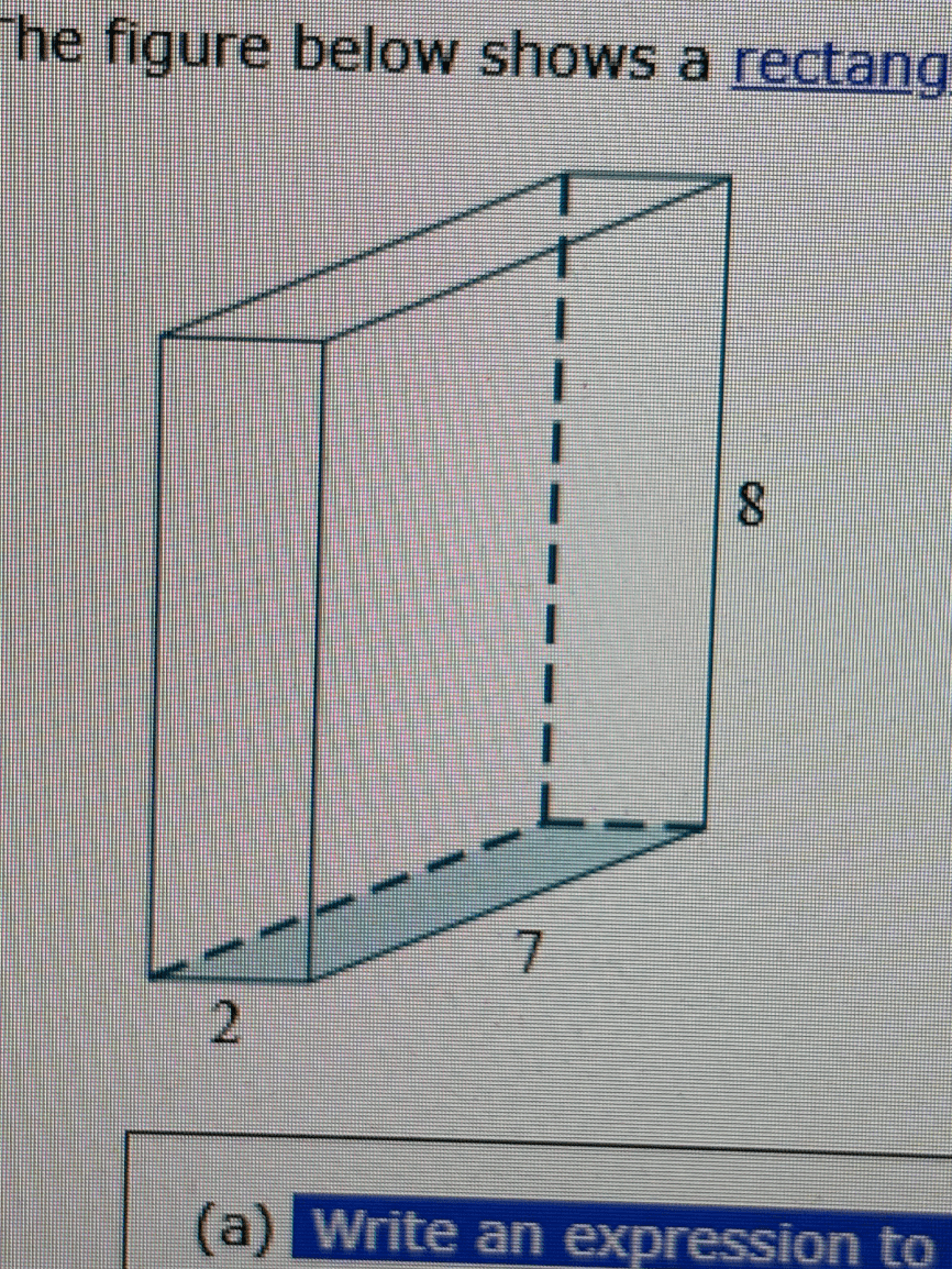 The figure below shows a rectangular prism. One base of the prism is shaded.