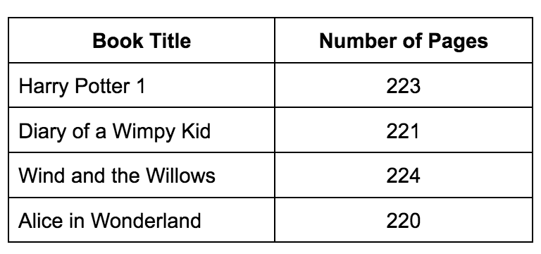 The table below shows the number of pages in each book