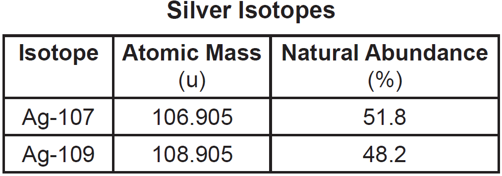 The atomic masses and natural abundances of the two naturally occurring isotopes of silver are shown in the table below.