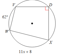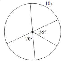 A central angle measures (3x+10)∘ and its intercepted arc measures (5x−20)∘. Solve for x.