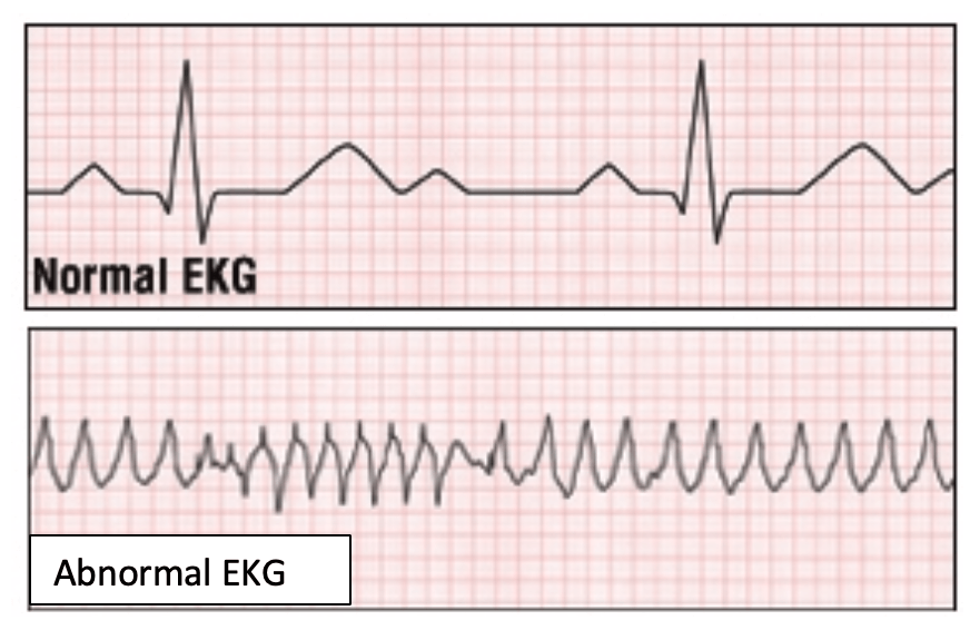 Compare the normal EKG in the image to the one below it. What imbalance of the intrinsic conduction system is shown?