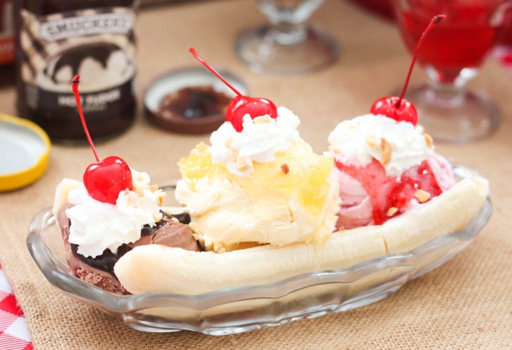 This is an oldie, but a goodie. It's served with vanilla, chocolate, and strawberry ice cream between bananas and topped with whipped cream and cherries.