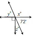angle x = 108 degrees, angle y = 72 degrees, and angle = 18 degrees