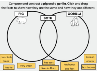 Gorillas climb trees and live in Africa whereas pigs do not climb trees and live on a farm.