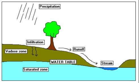 This diagram shows how water moves across land to gather in streams. It can even soak through the ground to form collections of water underground. What is the best definition for the word infiltration?