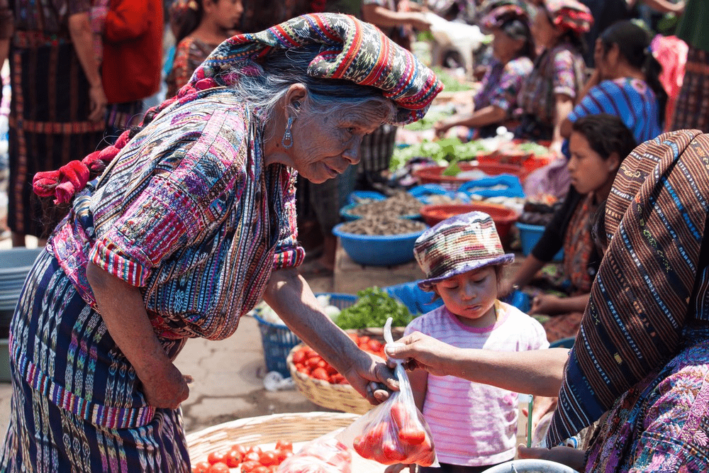 La chica a la derecha lleva un vestido lila y amarillo. Tiene unos once años. Es indígena mexicana.