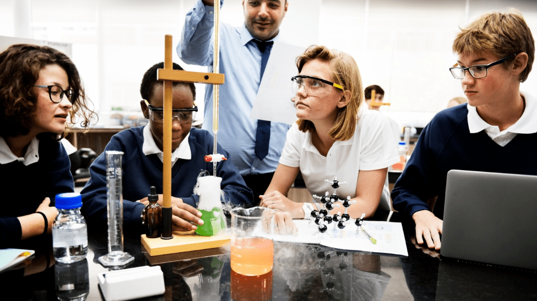 En la foto vemos una chica en una clase con sus amigas que están estudiando matemáticas porque en el futuro quieren ser ingenieras.