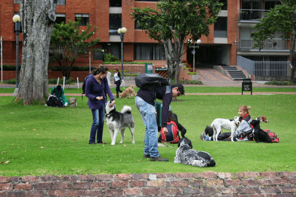 En la foto vemos muchas personas en un parque con sus perros porque están paseando sus perros.