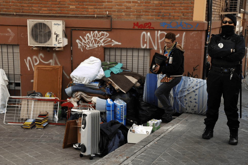 En el centro hay una mujer en la calle (sted) con sus muebles porque no tiene una casa debido a la crisis financiera en España.