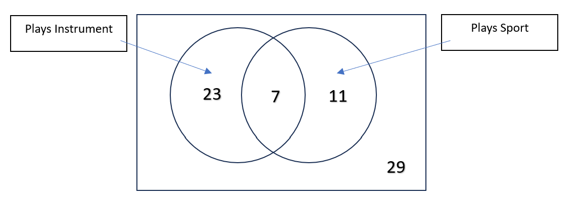 Of Mrs. Poole's 70 students, 30 play an instrument, 18 play a sport, and 7 do both.  Create a Venn Diagram to display the data and then find the Probability that a student does not play an instrument.
