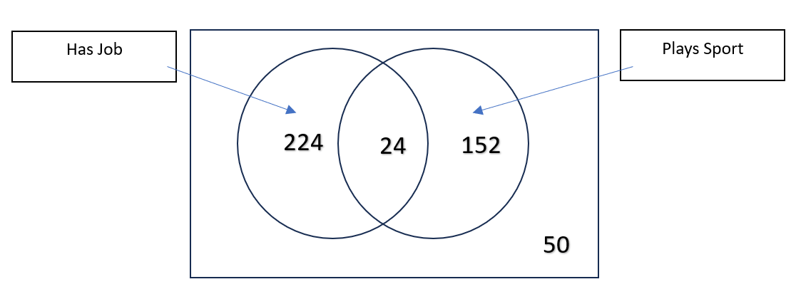 Out of 450 college students surveyed, 248 reported having a job and 176 played a sport.  Fifty students reported they neither play a sport or have a job. Create a Venn Diagram to display the data.  Then, find the probability that a student has a job given that they play a sport.