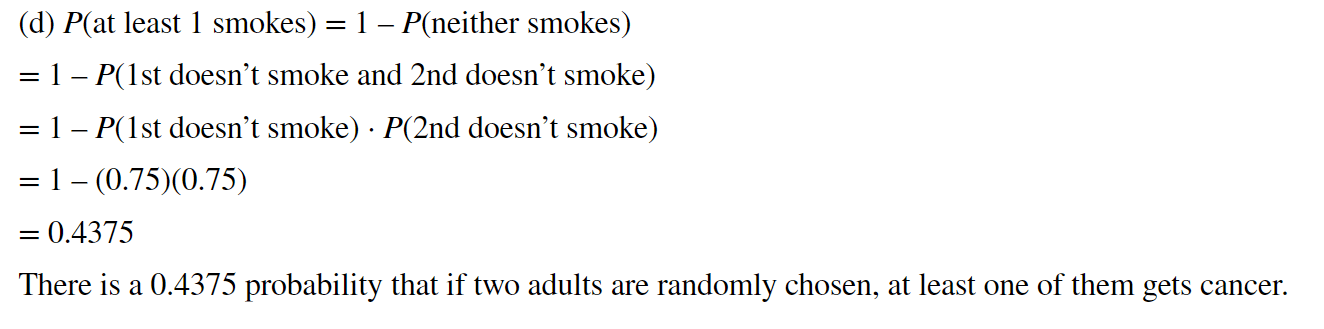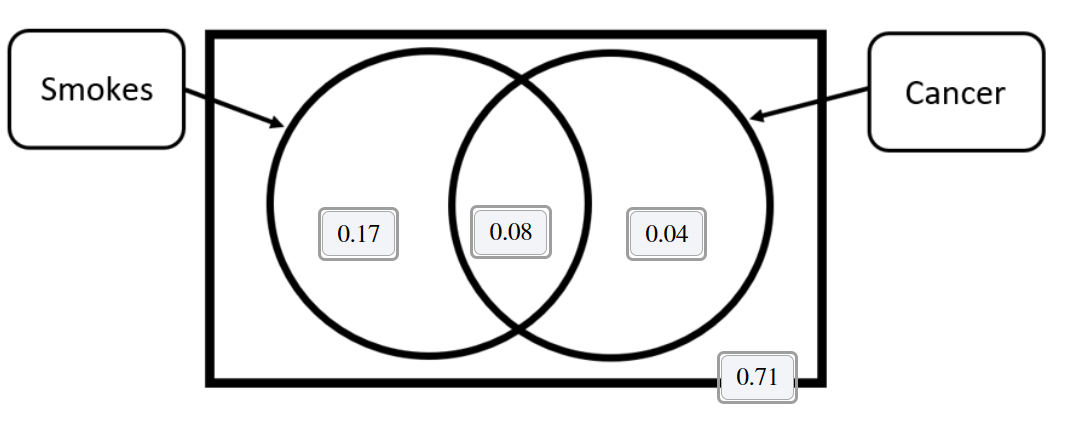 P(smokes or cancer)= P(smokes) +P(cancer)- P(both)