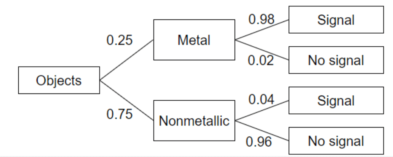 Create a tree diagram to display the data and find the probability that the boy has found a metal object if the machine gives a signal when it passes over the object.