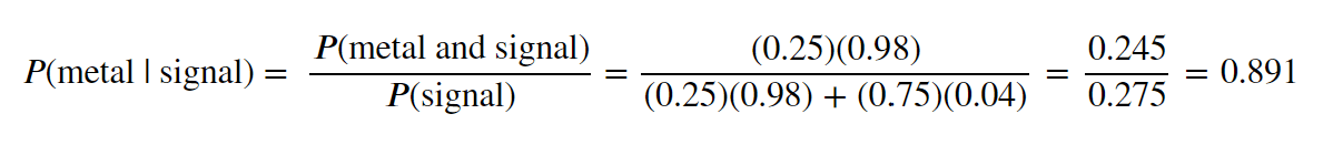 A boy uses a homemade metal detector to look for valuable metal objects on a beach. The machine isn’t perfect—it detects only 98% of the metal objects over which it passes, and it detects 4% of the nonmetallic objects over which it passes. Suppose that 25% of the objects that the machine passes over are metal. Choose an object from this beach at random.  If the machine gives a signal when it passes over this object, find the probability that the boy has found a metal object.