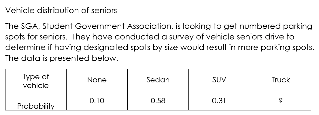 Given the table below determine the probability that a senior owns a sedan or an SUV.