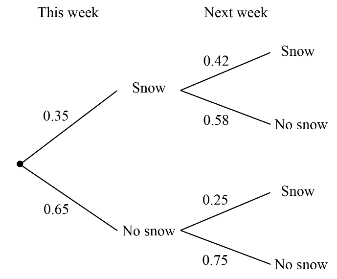 Use the following tree diagram to determine the probabilty that it snows two weeks in a row.