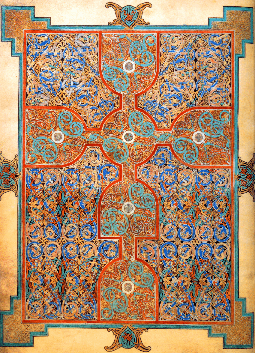 This carpet page from the Lindisfarne Gospels depicts this Hiberno-Saxon style interlacing in its pattern