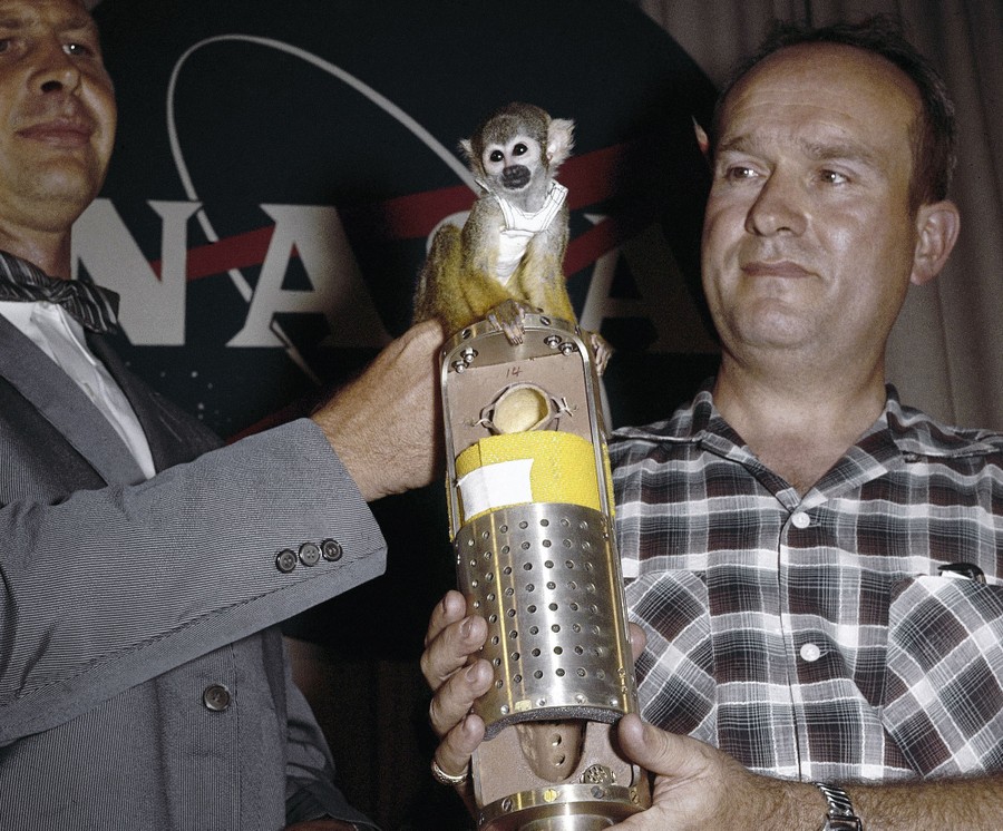 The space monkey Baker shown during a press conference in Cape Canaveral, Florida, on May 29, 1965, after his successful flight. Baker was this type of monkey and was retrieved with his partner Able, a rhesus monkey.