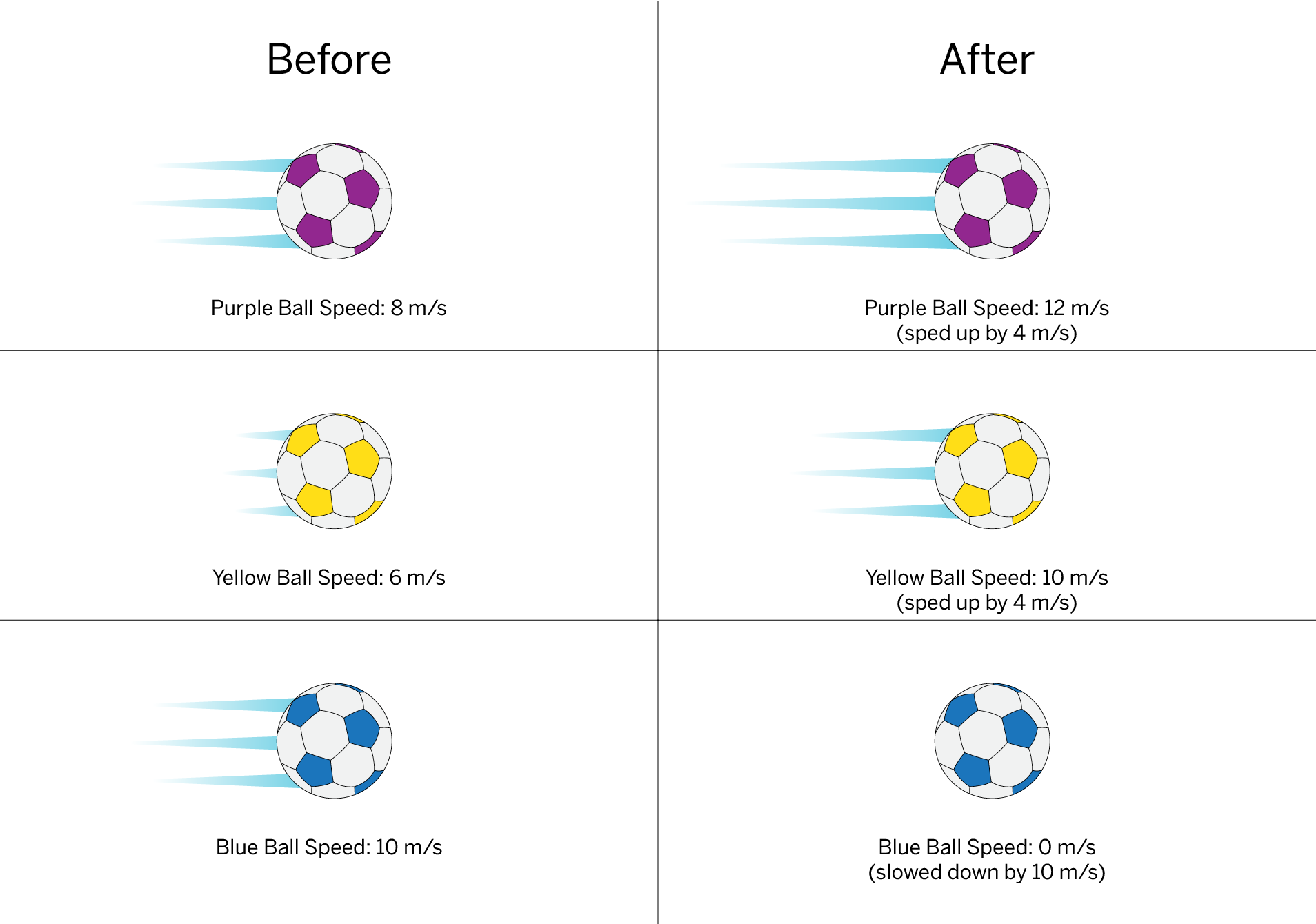 4. In soccer, players kick a soccer ball across a flat field. At practice one day, three soccer balls that have the same mass were rolling across the field. They were each kicked by a soccer player, but not from the same direction. Each soccer ball changed speed as a result of being kicked. Use the information in the diagram to answer.